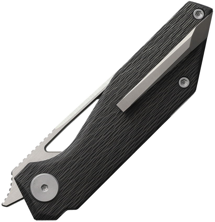 3.88″ (9.86cm) closed. 2.5″ (6.35cm) satin finish Bohler M390 stainless tanto blade. Carbon fiber handle. Thumb pull. Extended tang. Pocket clip. Boxed.