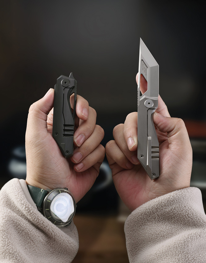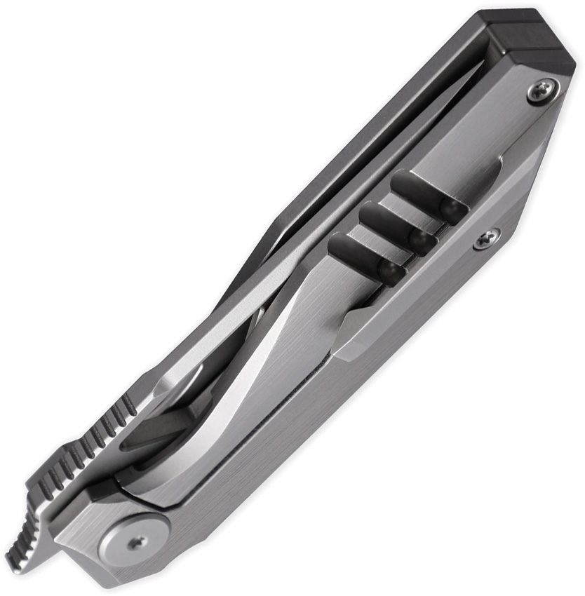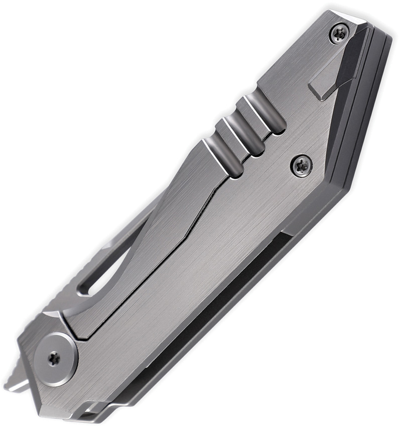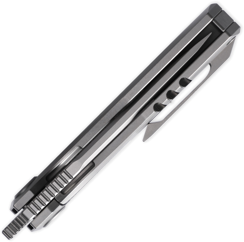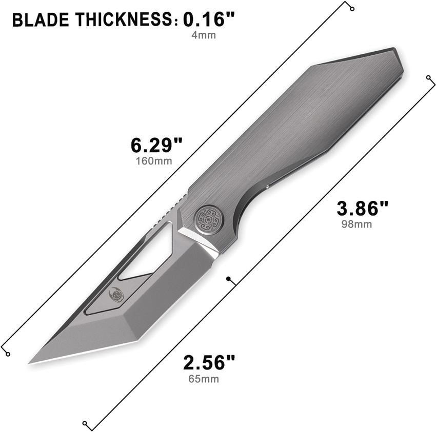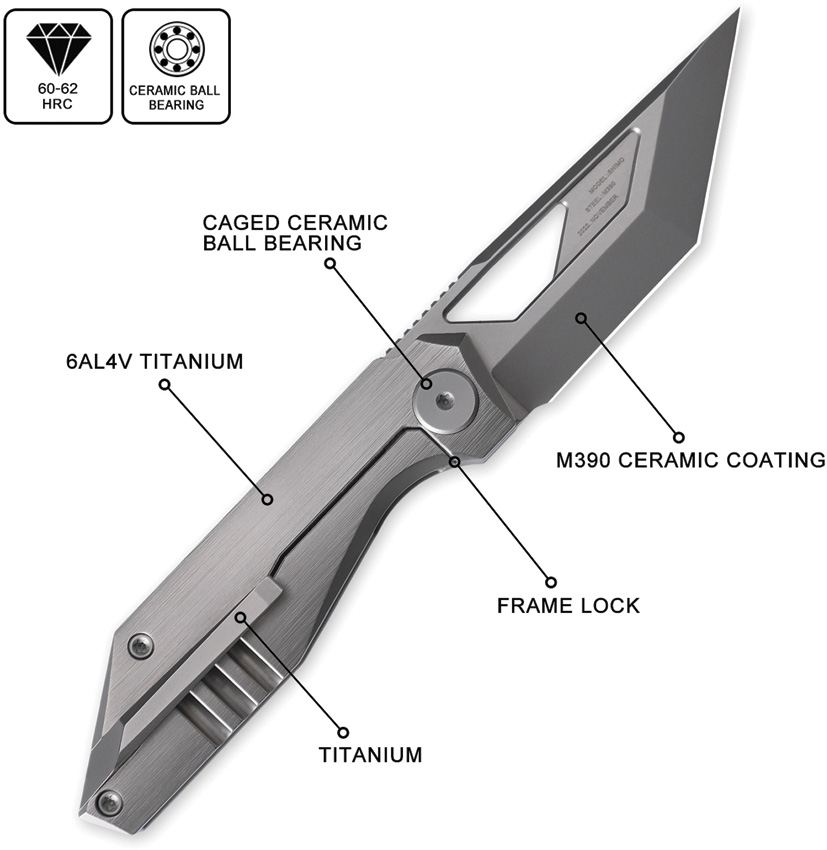3.88″ (9.86cm) closed. 2.5″ (6.35cm) gray ceramic coated Bohler M390 stainless tanto blade. Gray titanium handle. Thumb pull. Pocket clip. Boxed.