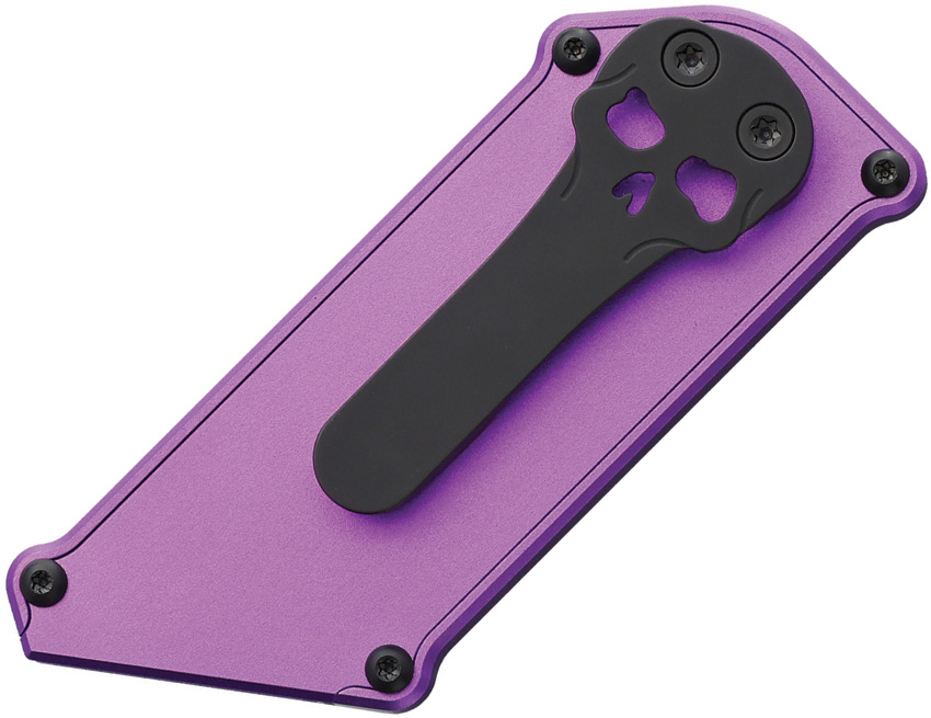 3″ (7.62cm) closed. Purple anodized aluminum handle. 1.25″ black PVD coated stainless blade holder. Comes with one replaceable utility razor blade. Chaves skull pocket clip. Boxed.