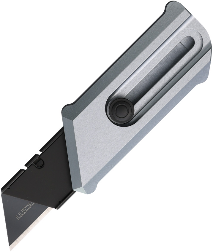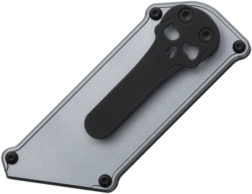 3.13″ (7.95cm) closed. Gray anodized aluminum handle. Thumb slide. Black PVD coated stainless blade holder. Standard razor blade. Chaves skull pocket clip. Boxed.