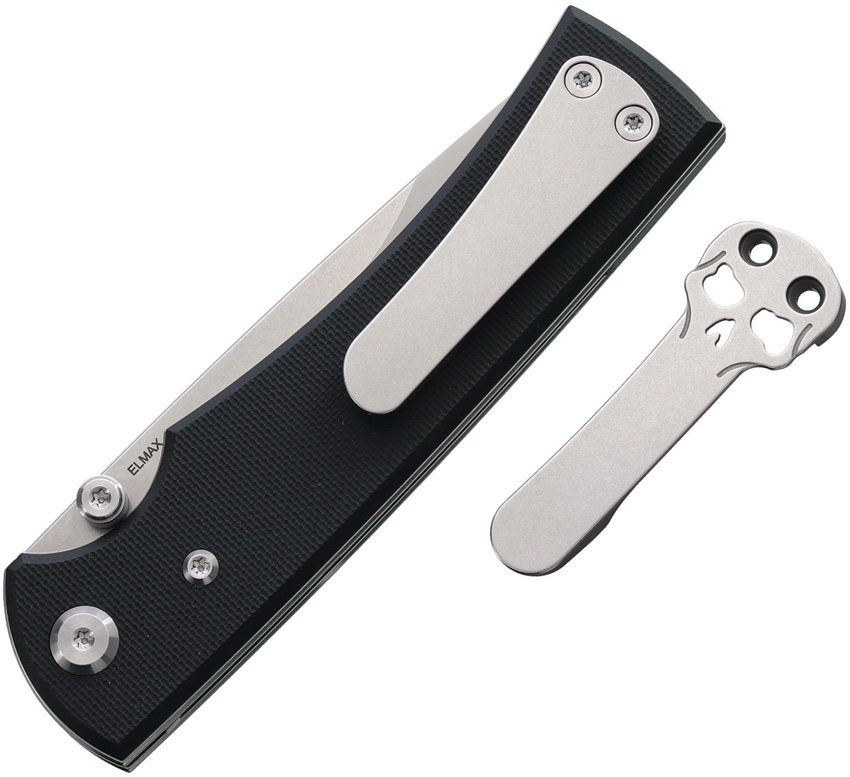 4.5″ (11.43cm) closed. 3.5″ (8.89cm) stonewash and satin finish Elmax steel drop point blade. Black G10 handle. Thumb stud. Pocket clip. Comes with traditional and Chaves skull titanium pocket clips. Boxed.