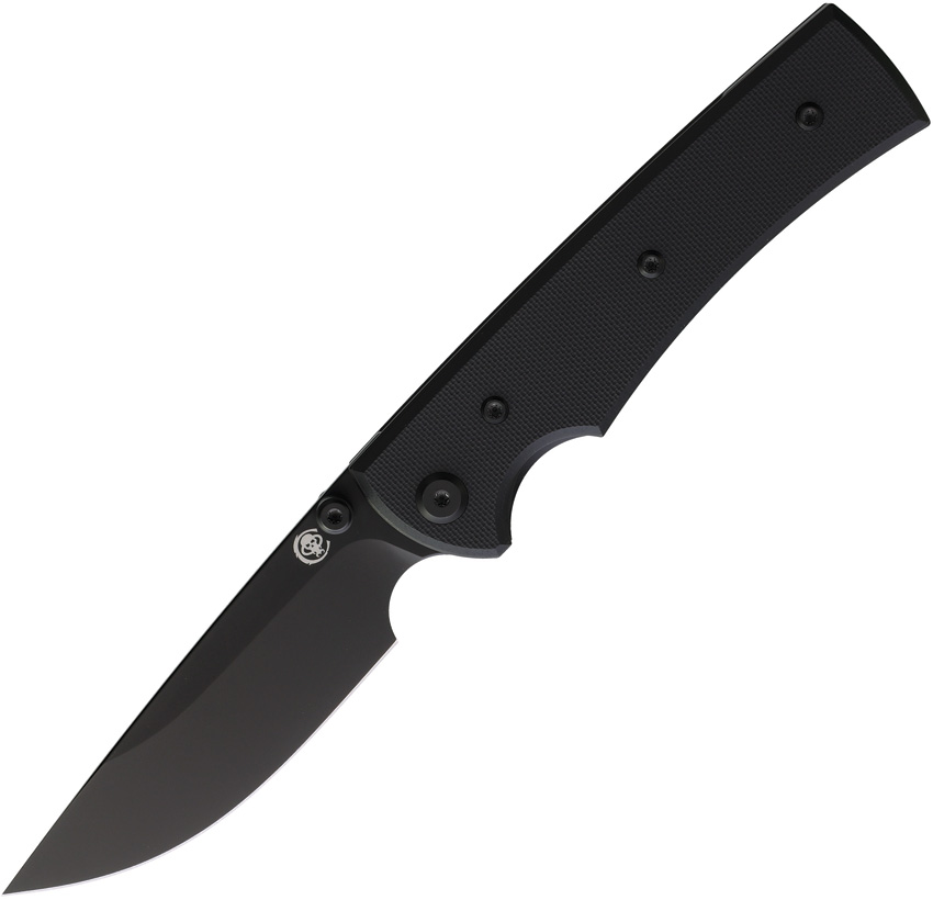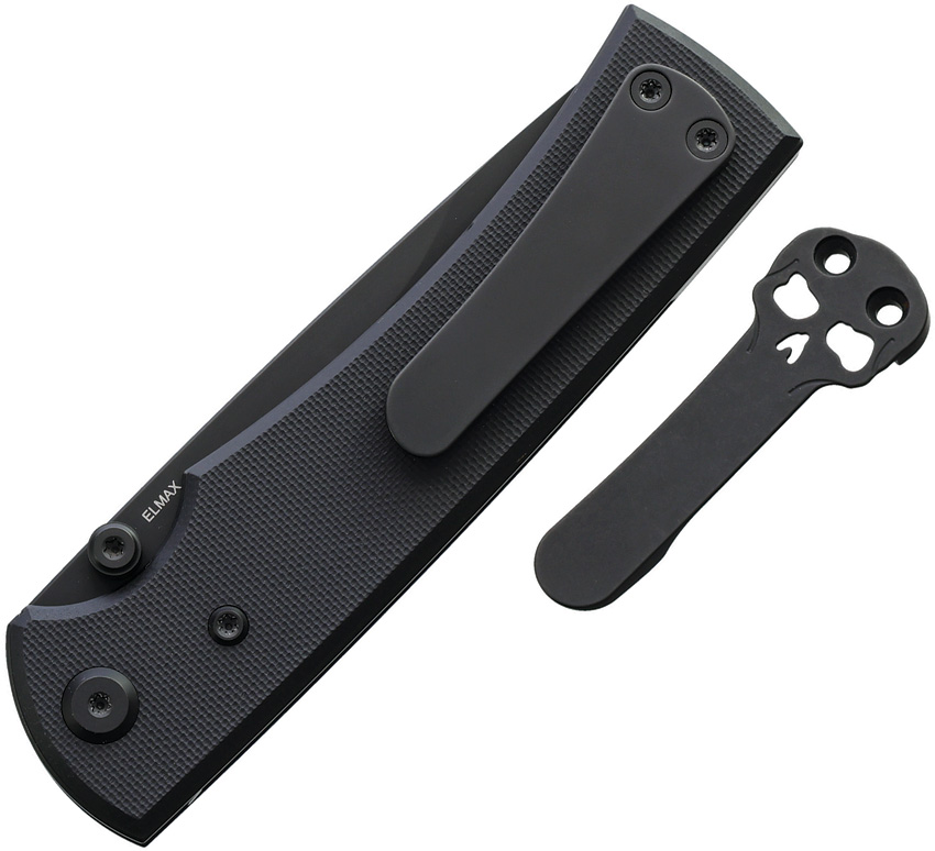 4.5″ (11.43cm) closed. 3.5″ (8.89cm) black PVD coated Elmax steel drop point blade. Black G10 handle. Thumb stud. Pocket clip. Comes with traditional and Chaves skull titanium pocket clips. Boxed.