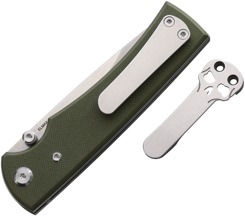 4.5″ (11.43cm) closed. 3.5″ (8.89cm) stonewash and satin finish Elmax steel drop point blade. OD green G10 handle. Thumb stud. Pocket clip. Comes with traditional and Chaves skull titanium pocket clips. Boxed.