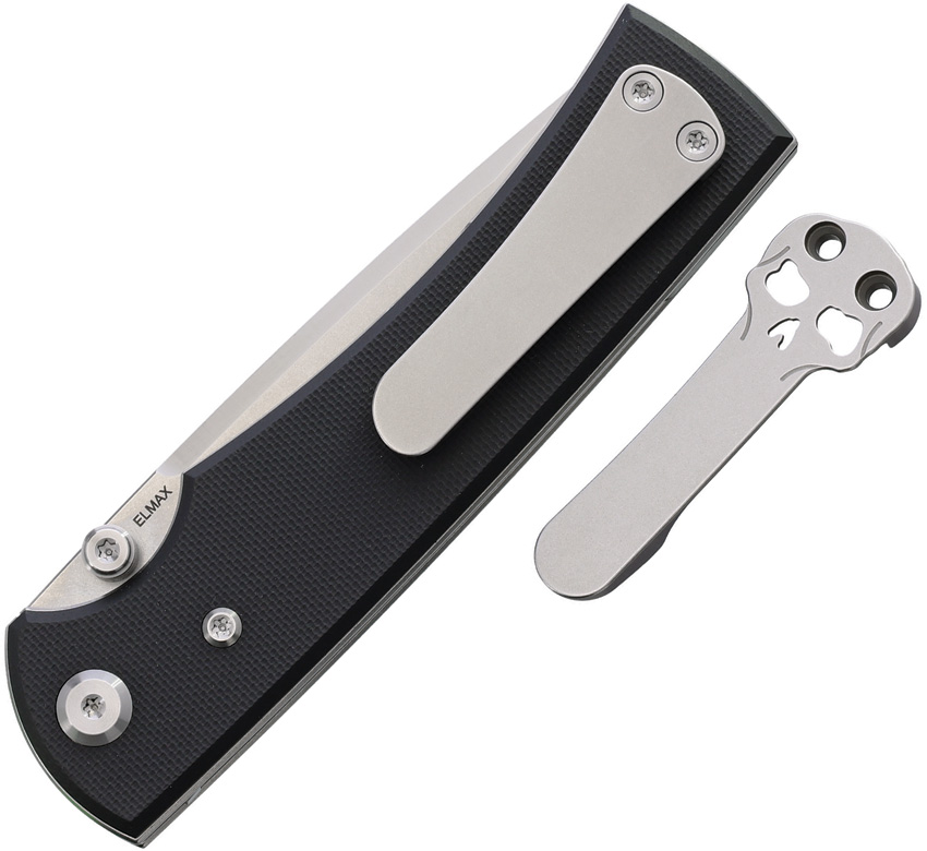4.5″ (11.43cm) closed. 3.5″ (8.89cm) stonewash and satin finish Elmax steel tanto blade. Black G10 handle. Thumb stud. Pocket clip. Comes with signature Chaves skull titanium pocket clip. Boxed.