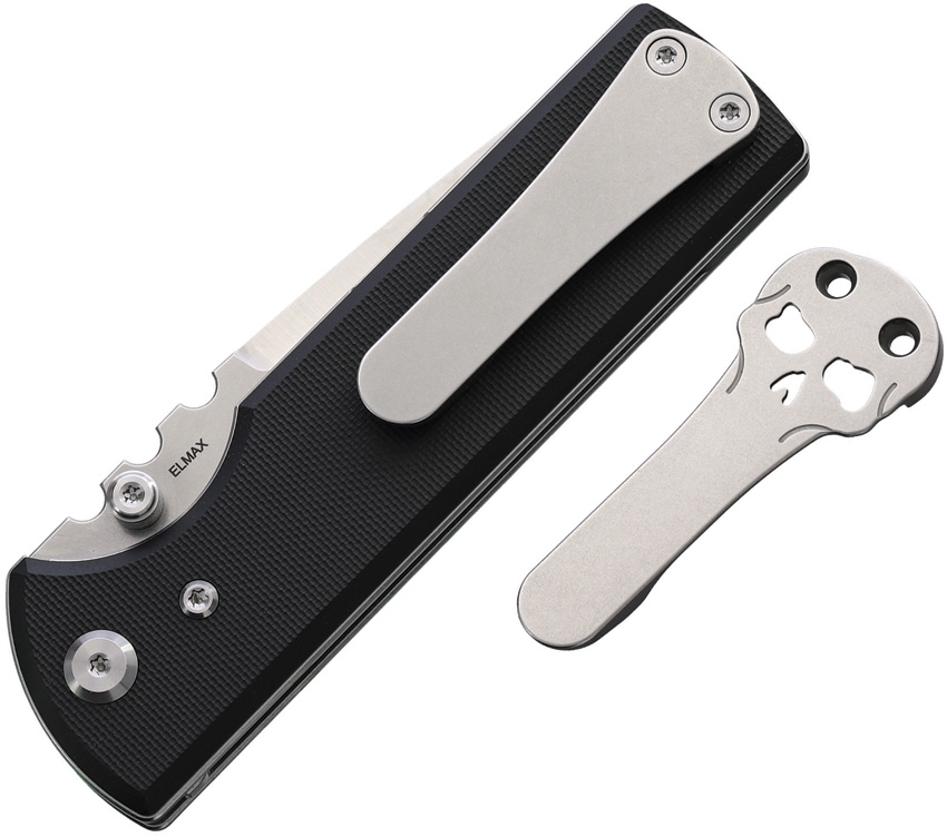 4.5″ (11.43cm) closed. 3.5″ (8.89cm) stonewash and satin finish Elmax steel drop point blade. Black G10 handle. Thumb stud. Pocket clip. Comes with traditional and Chaves skull titanium pocket clips. Boxed.