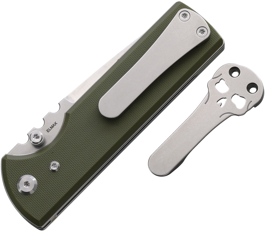 4.5″ (11.43cm) closed. 3.5″ (8.89cm) stonewash and satin finish Elmax steel drop point blade. OD green G10 handle. Thumb stud. Pocket clip. Comes with traditional and Chaves skull titanium pocket clips. Boxed.
