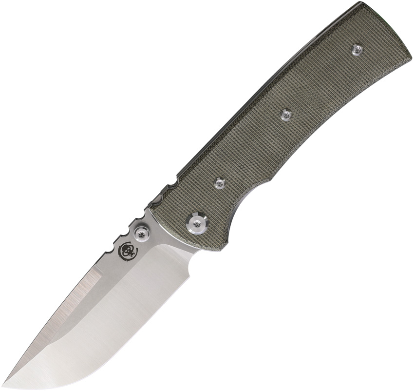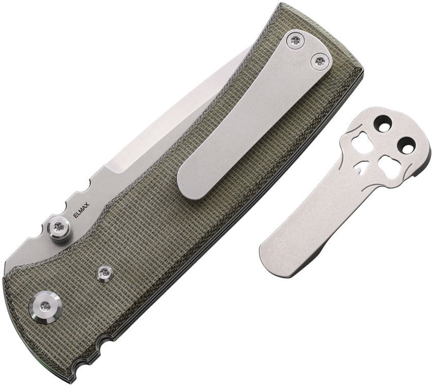 4.5″ (11.43cm) closed. 3.5″ (8.89cm) stonewash and satin finish Elmax steel drop point blade. Green canvas micarta handle. Thumb stud. Pocket clip. Comes with signature Chaves skull titanium pocket clip. Boxed.