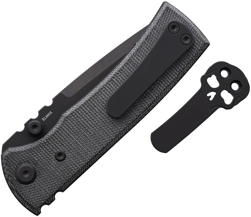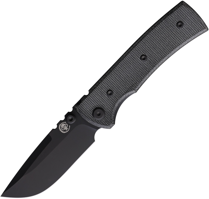 Blue Label Series. 4″ (10.16cm) closed. 3″ (7.62cm) black PVD coated Elmax steel drop point blade. Black canvas micarta handle. Thumb stud. Pocket clip. Comes with signature Chaves skull titanium pocket clip. Boxed.
