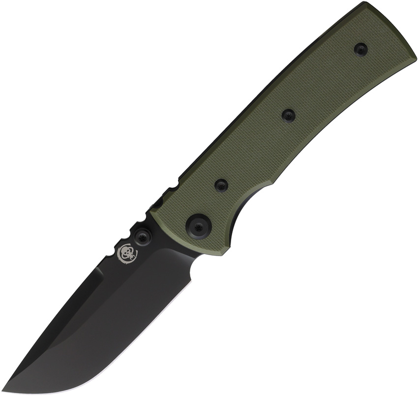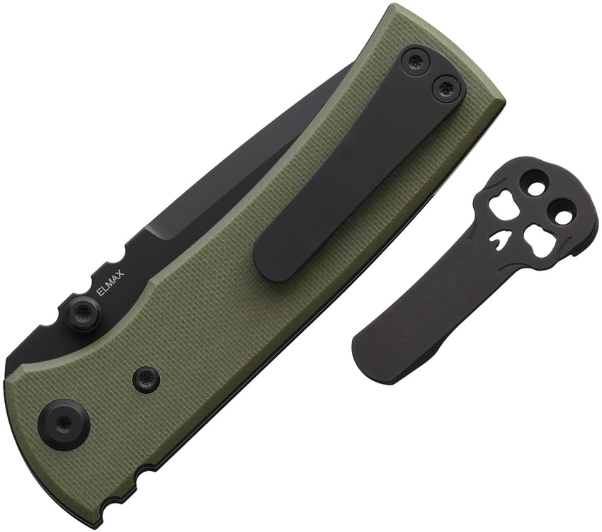 4.13″ (10.49cm) closed. 3.13″ (7.95cm) black PVD coated Elmax steel drop point blade. OD green G10 handle. Thumb stud. Pocket clip. Comes with traditional and signature Chaves skull titanium pocket clips. Boxed.