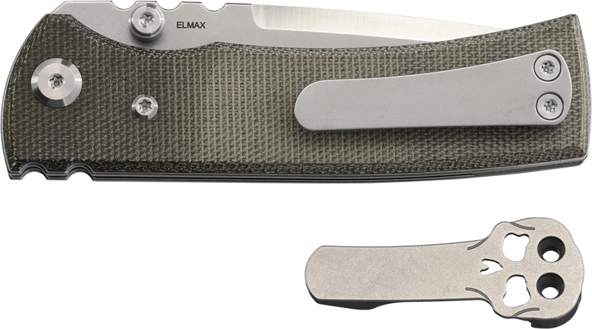 4″ (10.16cm) closed. 3″ (7.62cm) satin finish Elmax steel drop point blade. Green canvas micarta handle. Thumb stud. Comes with traditional and Chaves skull pocket clip. Boxed.