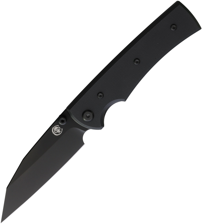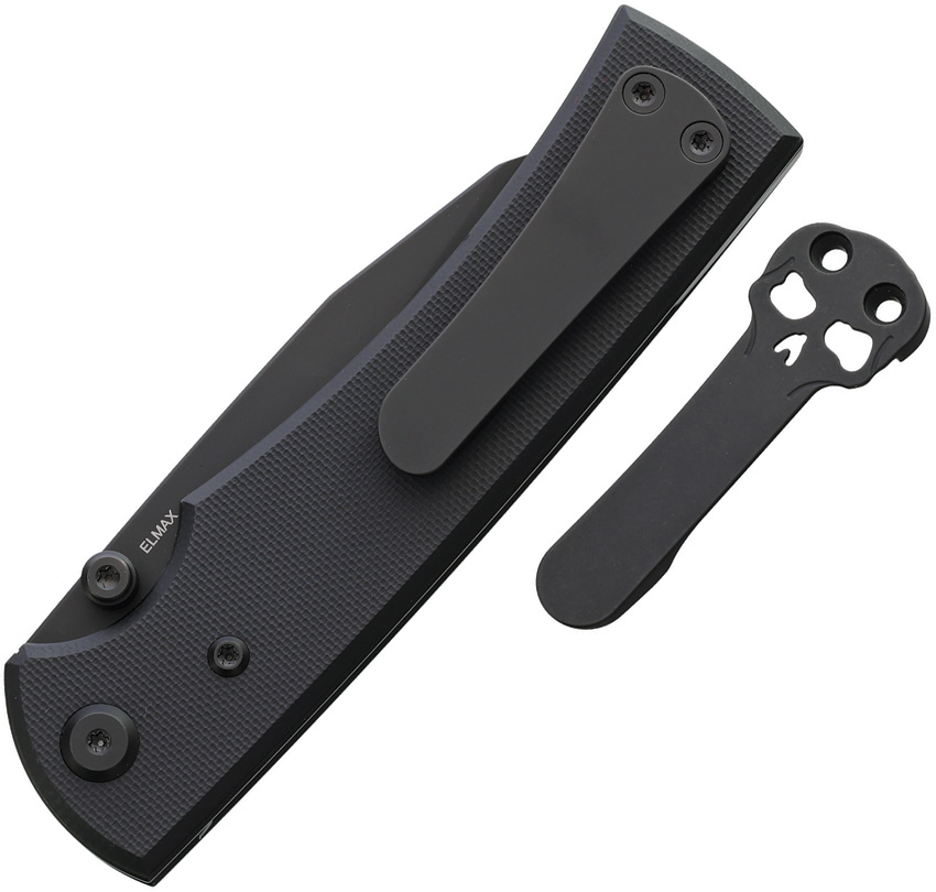 4.5″ (11.43cm) closed. 3.5″ (8.89cm) black PVD coated Elmax steel Wharncliffe blade. Black G10 handle. Thumb stud. Pocket clip. Comes with traditional and Chaves skull titanium pocket clips. Boxed.