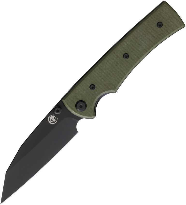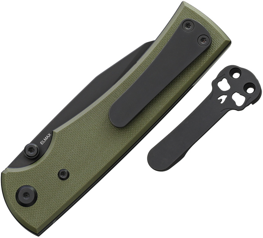 4.5″ (11.43cm) closed. 3.5″ (8.89cm) black PVD coated Elmax steel Wharncliffe blade. OD green G10 handle. Thumb stud. Pocket clip. Comes with traditional and Chaves skull titanium pocket clips. Boxed.