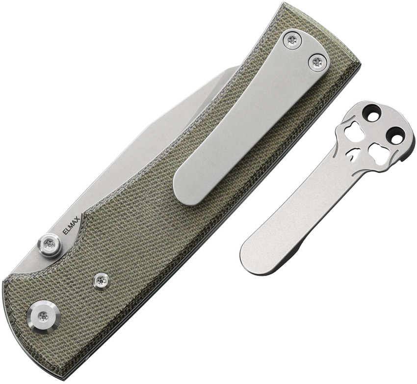 4.5″ (11.43cm) closed. 3.5″ (8.89cm) stonewash and satin finish Elmax steel Wharncliffe blade. Green canvas micarta handle. Thumb stud. Pocket clip. Comes with traditional and Chaves skull titanium pocket clips. Boxed.