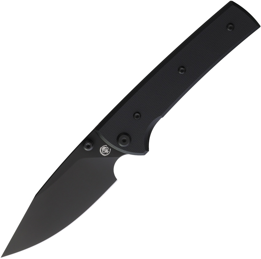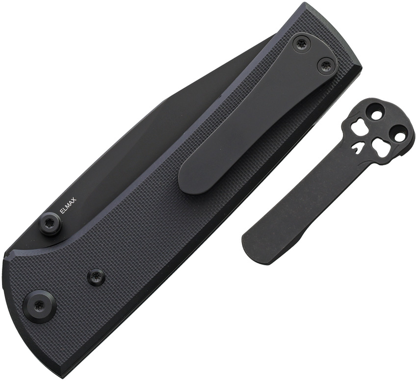 4.63″ (11.76cm) closed. 3.63″ (9.22cm) black PVD coated Elmax steel spear point blade. Black G10 handle. Thumb stud. Pocket clip. Comes with traditional and Chaves skull titanium pocket clips. Boxed.