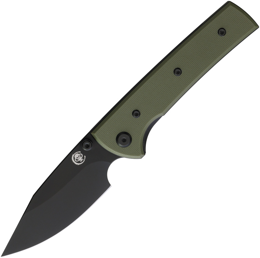 4.38″ (11.13cm) closed. 3.38″ (8.59cm) black PVD coated Elmax steel spear point blade. OD green G10 handle. Thumb stud. Pocket clip. Comes with traditional and Chaves skull titanium pocket clips. Boxed.