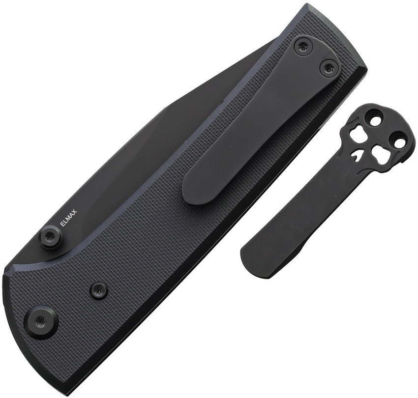 4.5″ (11.43cm) closed. 3.5″ (8.89cm) black PVD coated Elmax steel spear point blade. Black G10 handle. Thumb stud. Pocket clip. Comes with traditional and Chaves skull titanium pocket clips. Boxed.