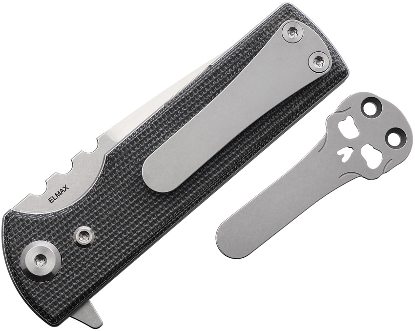 Blue Label Series. 3.38″ (8.59cm) closed. 2.63″ (6.68cm) stonewash and satin finish Elmax steel tanto blade. Black canvas micarta handle. Extended tang. Pocket clip. Comes with signature Chaves skull titanium pocket clip. Boxed.