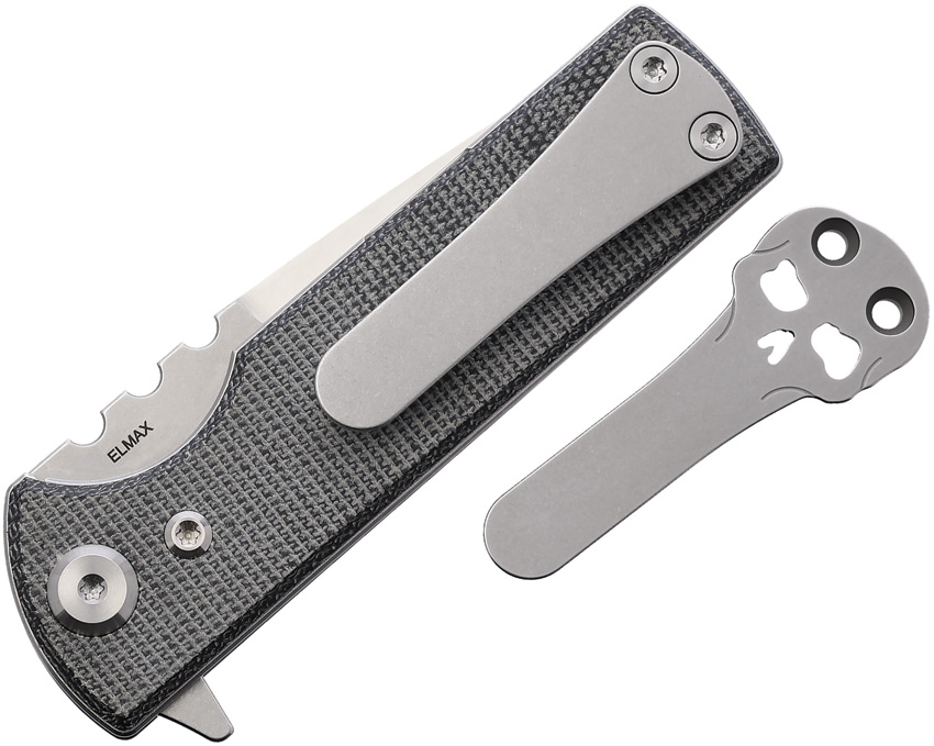 Blue Label Series. 3.38″ (8.59cm) closed. 2.63″ (6.68cm) stonewash and satin finish Elmax steel drop point blade. Black canvas micarta handle. Extended tang. Pocket clip. Comes with signature Chaves skull titanium pocket clip. Boxed.