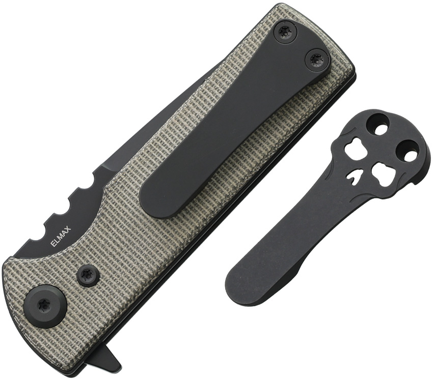 3.38″ (8.59cm) closed. 2.75″ (6.99cm) black PVD coated Elmax steel drop point blade. Green canvas micarta handle. Extended tang. Comes with traditional and Chaves skull pocket clips. Boxed.