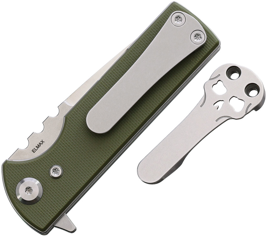 3.38″ (8.59cm) closed. 2.75″ (6.99cm) satin finish Elmax steel drop point blade. OD green G10 handle. Extended tang. Comes with traditional and Chaves skull pocket clips. Boxed.