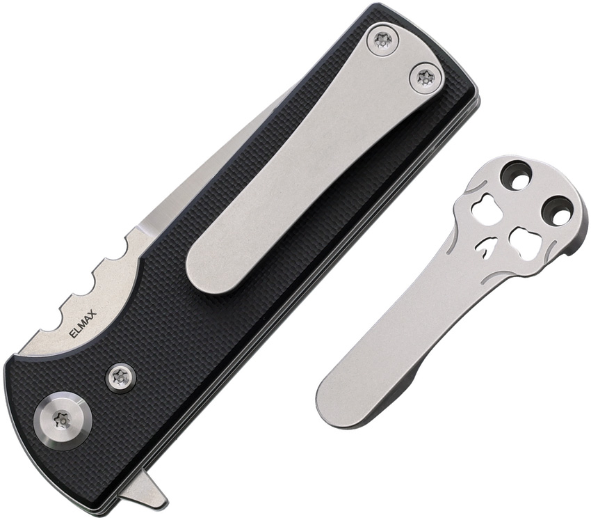 3.38″ (8.59cm) closed. 2.75″ (6.99cm) satin finish Elmax steel tanto blade. Black G10 handle. Extended tang. Comes with traditional and Chaves skull pocket clips. Boxed.