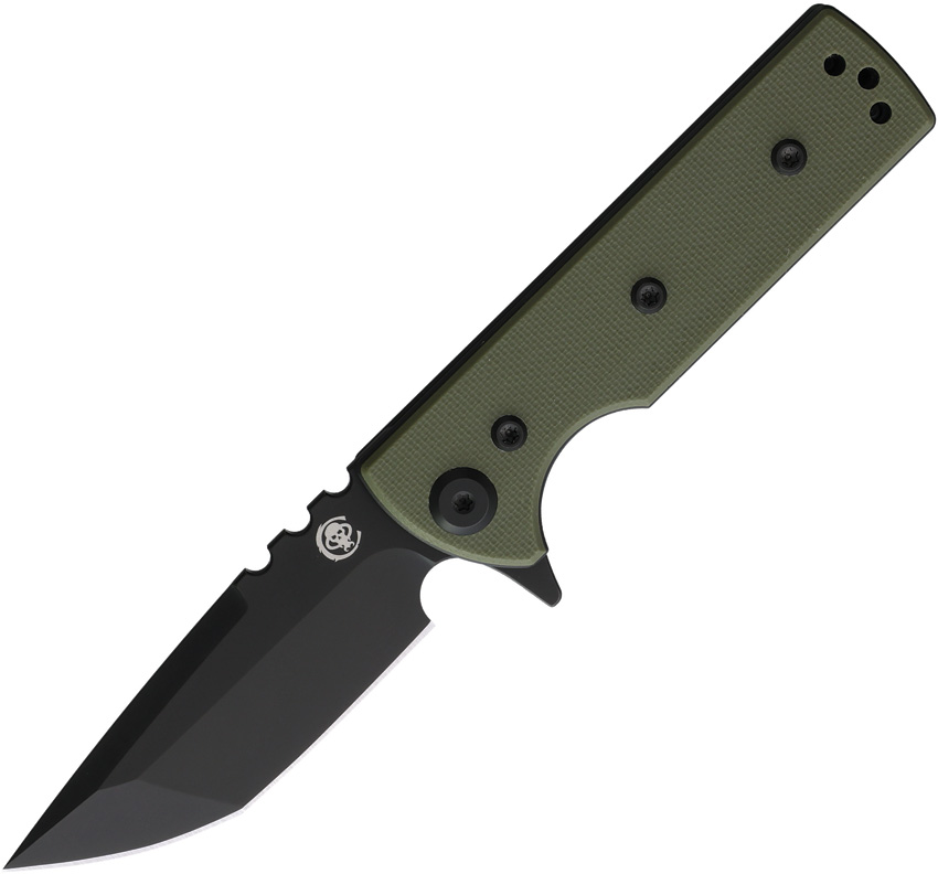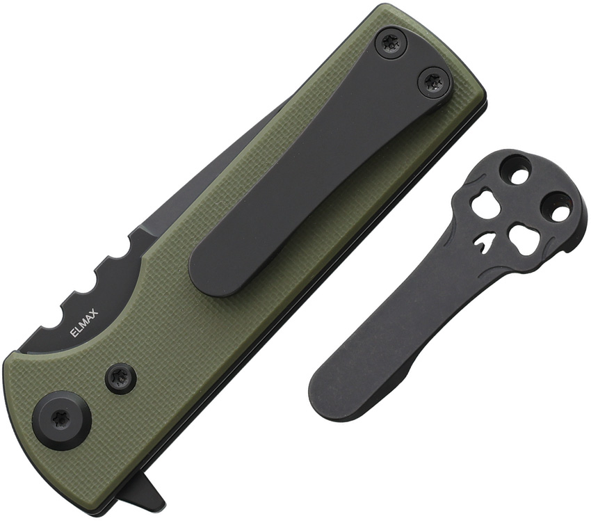 3.38″ (8.59cm) closed. 2.75″ (6.99cm) black PVD coated Elmax steel tanto blade. OD green G10 handle. Extended tang. Comes with traditional and Chaves skull pocket clips. Boxed.