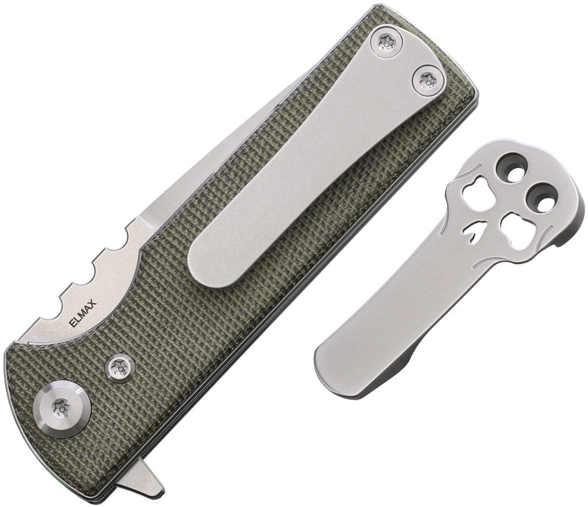 3.38″ (8.59cm) closed. 2.75″ (6.99cm) satin finish Elmax steel tanto blade. Green canvas micarta handle. Extended tang. Comes with traditional and Chaves skull pocket clips. Boxed.