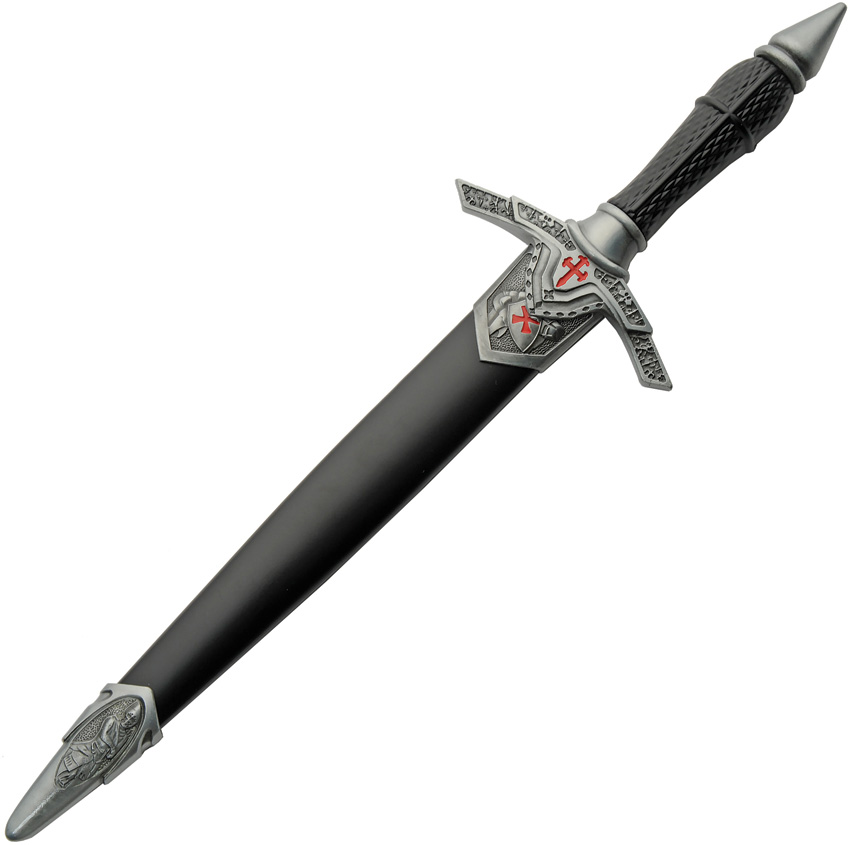 14.75″ (37.47cm) overall. 8.5″ (21.59cm) satin finish stainless dagger blade. Black ABS handle. Silver finish zinc alloy guard, pommel, and fittings. Black ABS scabbard.