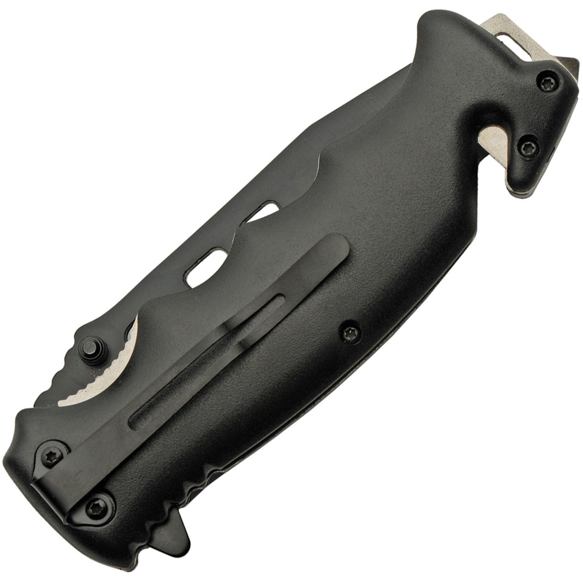Assisted opening. 4.75″ (12.07cm) closed. 3.75″ (9.53cm) black finish stainless blade. ABS handle. Extended tang. Glass breaker. Belt/cord cutter. Lanyard hole. Pocket clip. Thumb stud. Red, white, and blue 3-D printed handle artwork. Boxed.