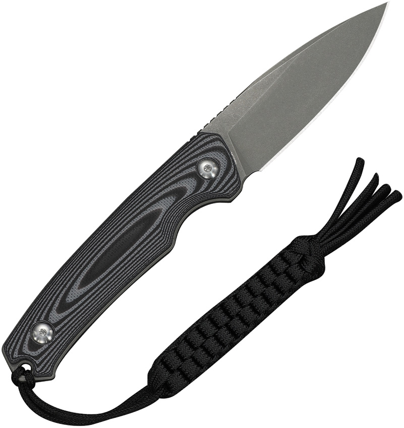 7.13″ (18.11cm) overall. 3″ (7.62cm) gray stonewash finish 14C28N Sandvik stainless drop point blade. Black and gray G10 handle. Full tang. Lanyard hole. Black Kydex belt sheath. Boxed.