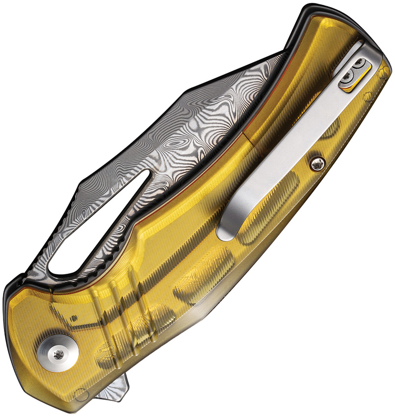 4.5″ (11.43cm) closed. 3.5″ (8.89cm) Damascus steel blade. Ultem handle. Extended tang. Thumb pull. Pocket clip. Black nylon zippered storage case. Boxed.
