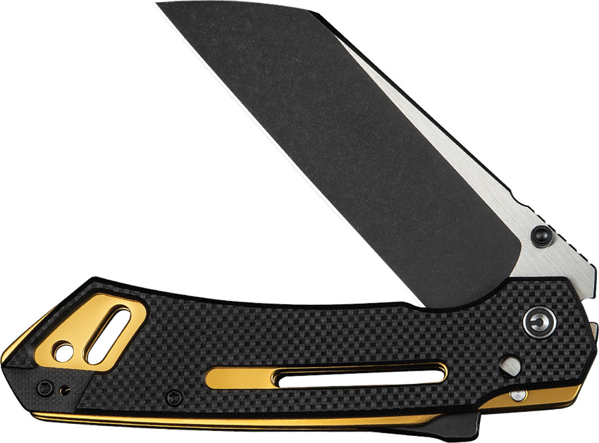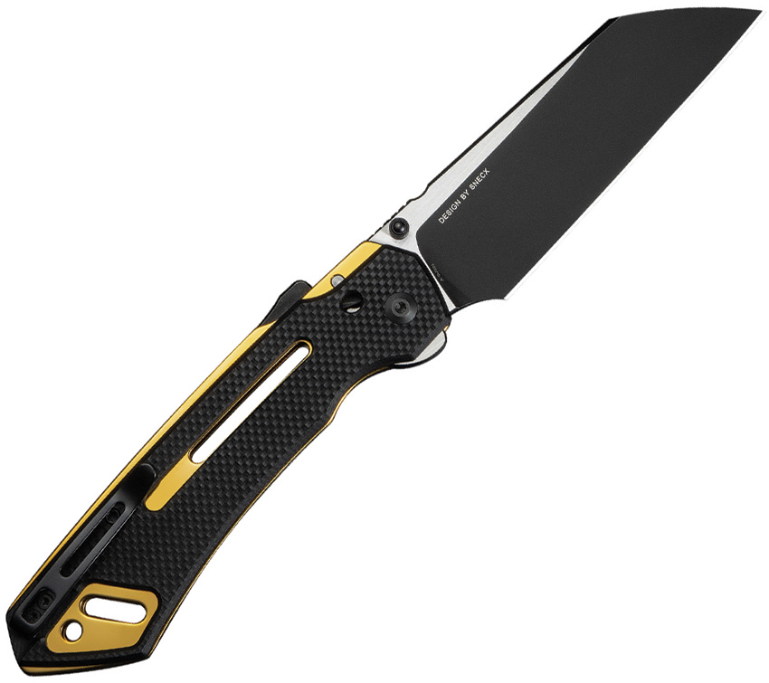 5.5″ (13.97cm) closed. 4.25″ (10.8cm) two-tone finish Nitro V steel sheepsfoot blade. Black textured G10 handle. Thumb stud. Extended tang. Pocket clip. Gold accents. Black nylon zippered storage case. Boxed.