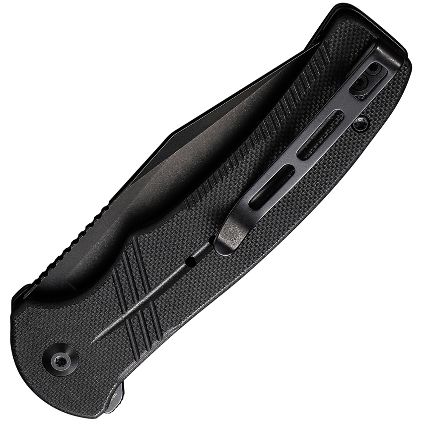 4.5″ (11.43cm) closed. 3.5″ (8.89cm) black stonewash finish partially serrated 14C28N Sandvik stainless clip point blade. Black G10 handle. Extended tang. Pocket clip. Black nylon zippered storage case. Boxed. Sales Restriction: No Amazon.com Sales.