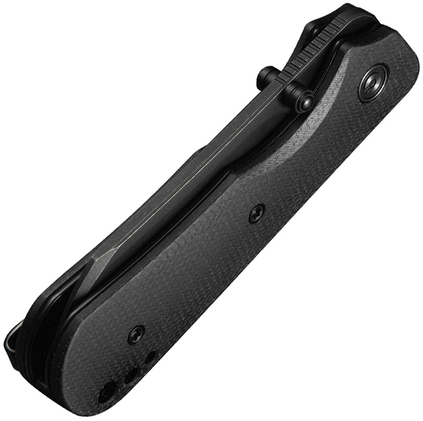 3.75″ (9.53cm) closed. 2.75″ (6.99cm) black stonewash finish 14C28N Sandvik stainless sheepsfoot blade. Black canvas micarta handle. Thumb stud. Lanyard hole. Pocket clip. Black nylon zippered storage case. Boxed.