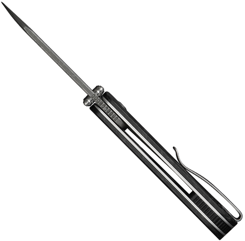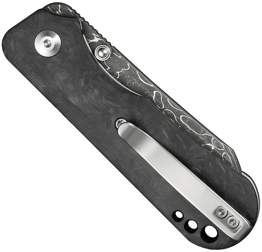 3.75″ (9.53cm) closed. 2.75″ (6.99cm) Damascus steel sheepsfoot blade. Shredded carbon fiber handle. Thumb stud. Lanyard hole. Pocket clip. Black nylon zippered storage case. Boxed.