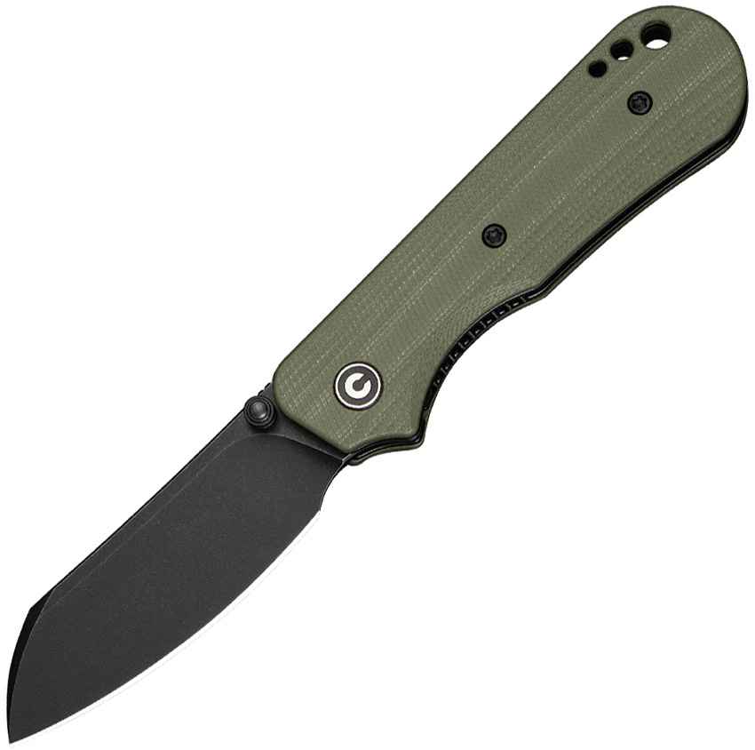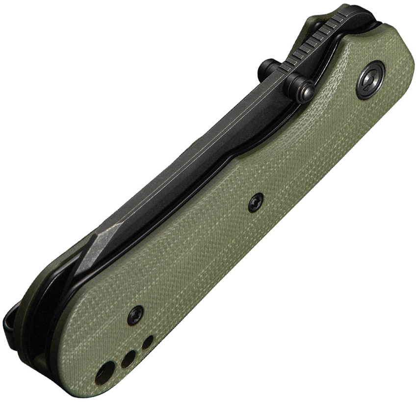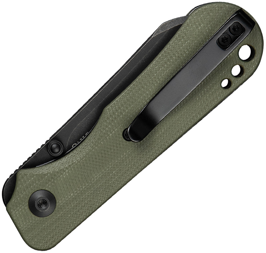3.75″ (9.53cm) closed. 2.75″ (6.99cm) black stonewash finish 14C28N Sandvik stainless sheepsfoot blade. OD green G10 handle. Thumb stud. Lanyard hole. Pocket clip. Black nylon zippered storage case. Boxed.