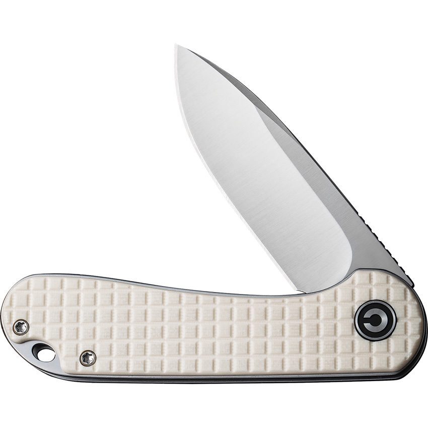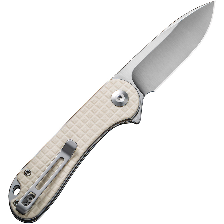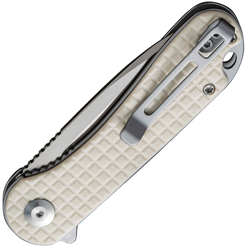 4″ (10.16cm) closed. 3″ (7.62cm) satin finish D2 tool steel blade. Ivory G10 handle. Extended tang. Lanyard hole. Pocket clip. Frag pattern handle. Black nylon zippered storage case. Boxed.