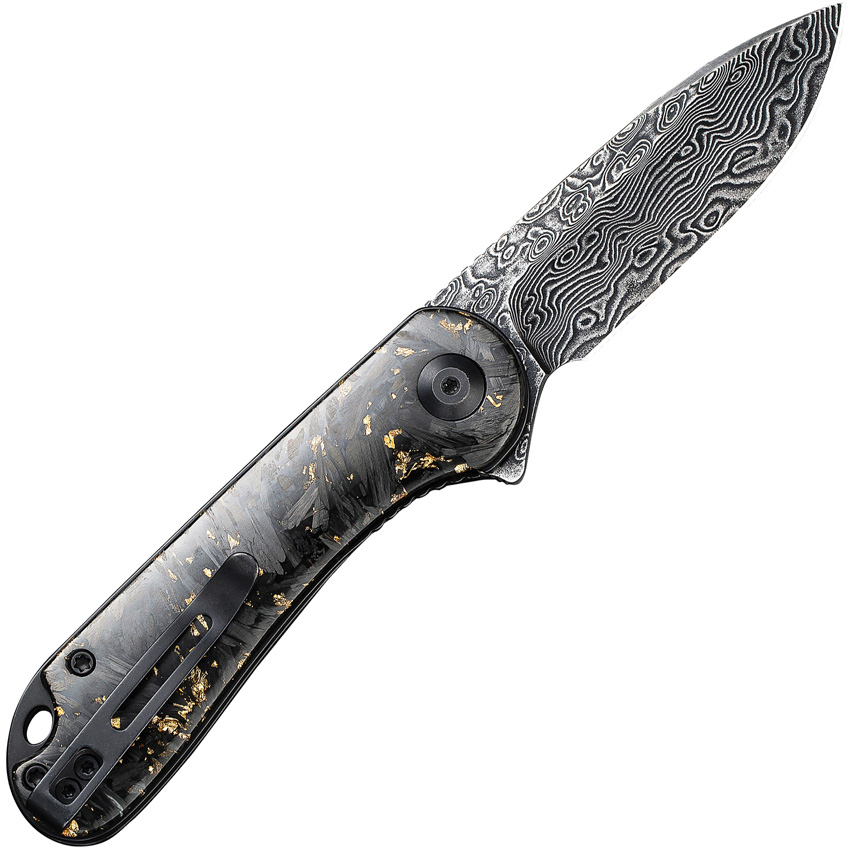 4″ (10.16cm) closed. 3″ (7.62cm) Damascus steel blade. Extended tang. Lanyard hole. Pocket clip. Black hand rubbed finish blade. Golden shred in clear resin and shredded carbon fiber handle. Black nylon zippered storage case. Boxed.