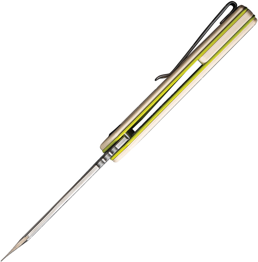 4″ (10.16cm) closed. 3″ (7.62cm) satin finish Nitro V steel blade. Ivory G10 handle. Extended tang. Pocket clip. Reverse tanto blade. Black nylon zippered storage case. Boxed.