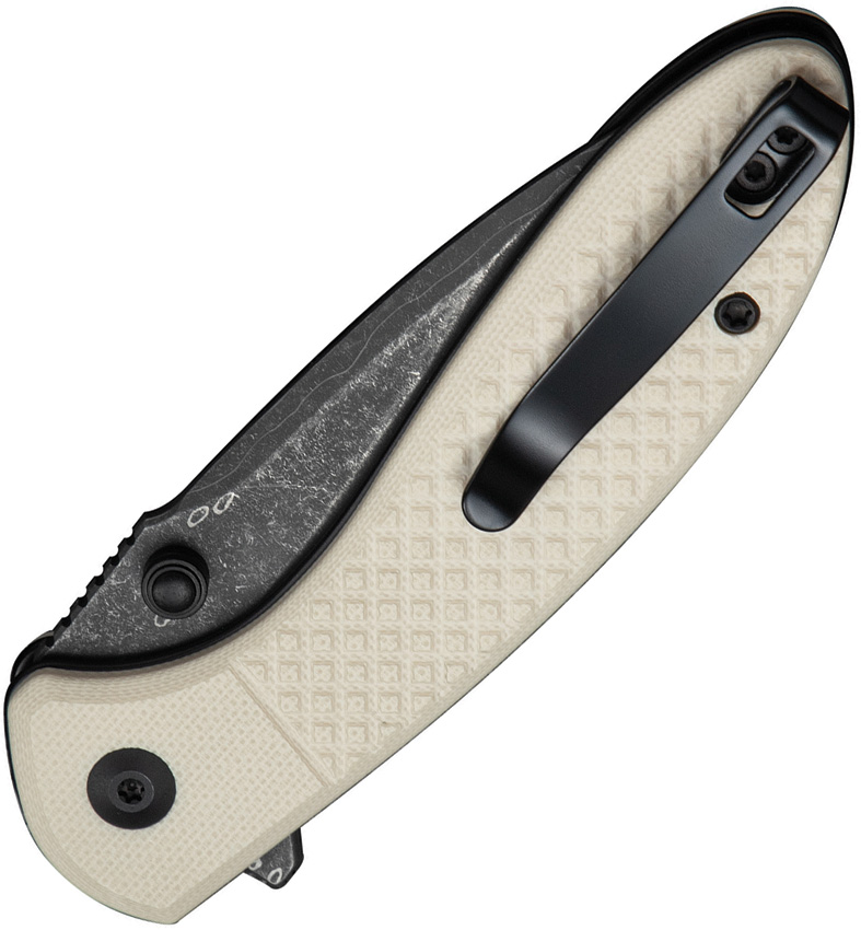 4.13″ (10.49cm) closed. 3″ (7.62cm) black stonewash finish Damascus steel drop point blade. Ivory G10 handle. Extended tang. Thumb stud. Pocket clip. Black Kydex belt sheath. Boxed.