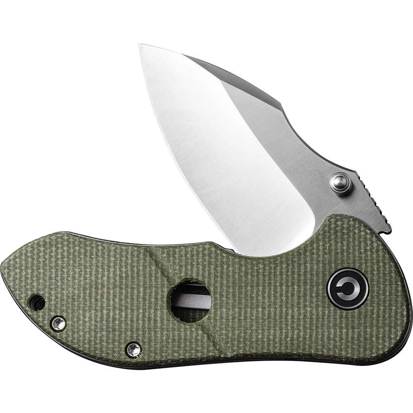 3.5″ (8.89cm) closed. 2.5″ (6.35cm) satin finish D2 tool steel blade. Green G10 handle. Extended tang. Lanyard hole. Thumb stud. Pocket clip. Black nylon belt sheath. Boxed.