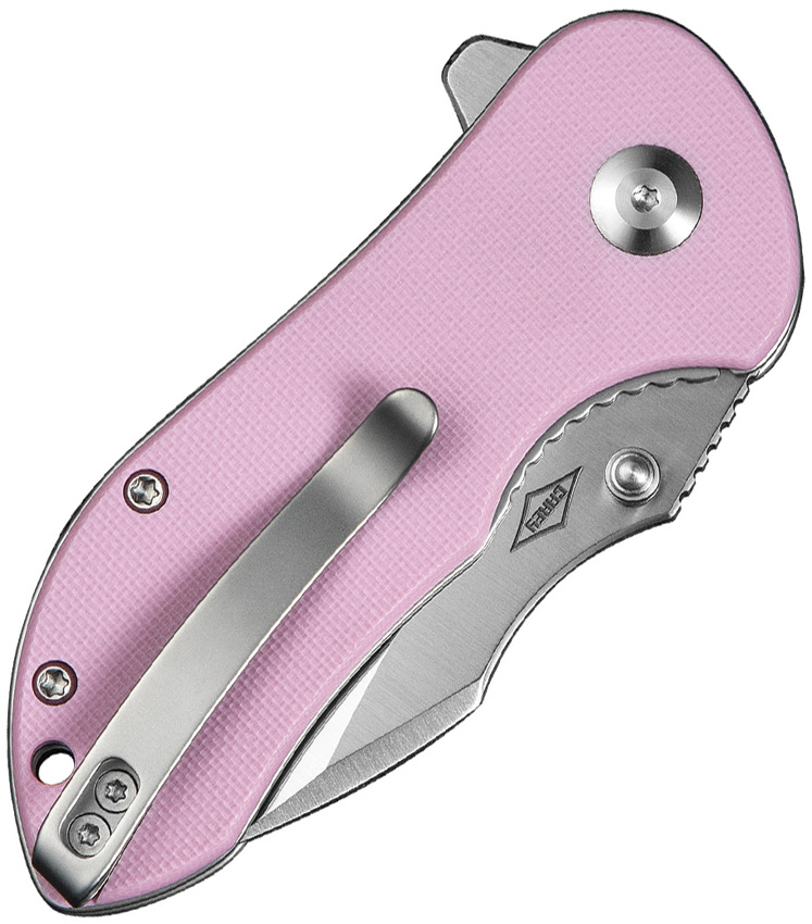 3.5″ (8.89cm) closed. 2.5″ (6.35cm) satin finish D2 tool steel blade. Pink G10 handle. Extended tang. Lanyard hole. Thumb stud. Pocket clip. Boxed.