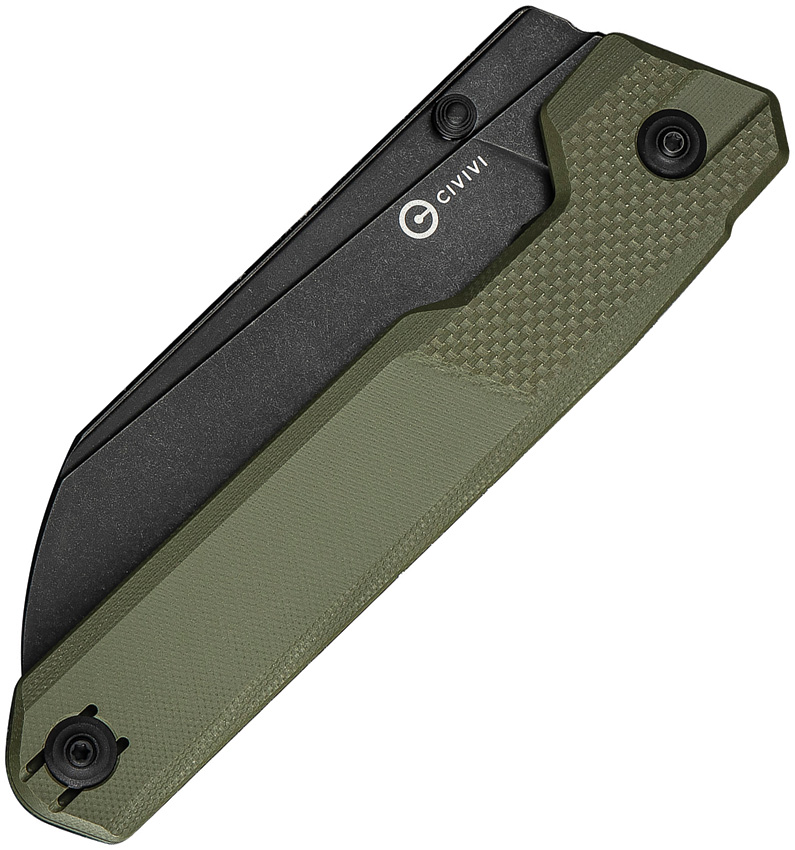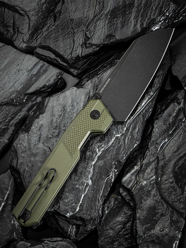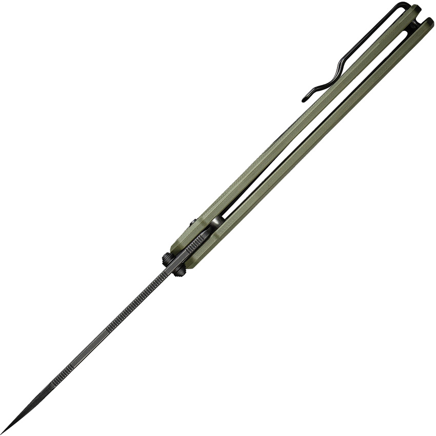 5.75″ (14.61cm) closed. 4.13″ (10.49cm) black stonewash finish 14C28N Sandvik stainless blade. OD green G10 handle. Thumb stud. Pocket clip. Reverse tanto blade. Black nylon zippered storage case. Boxed.