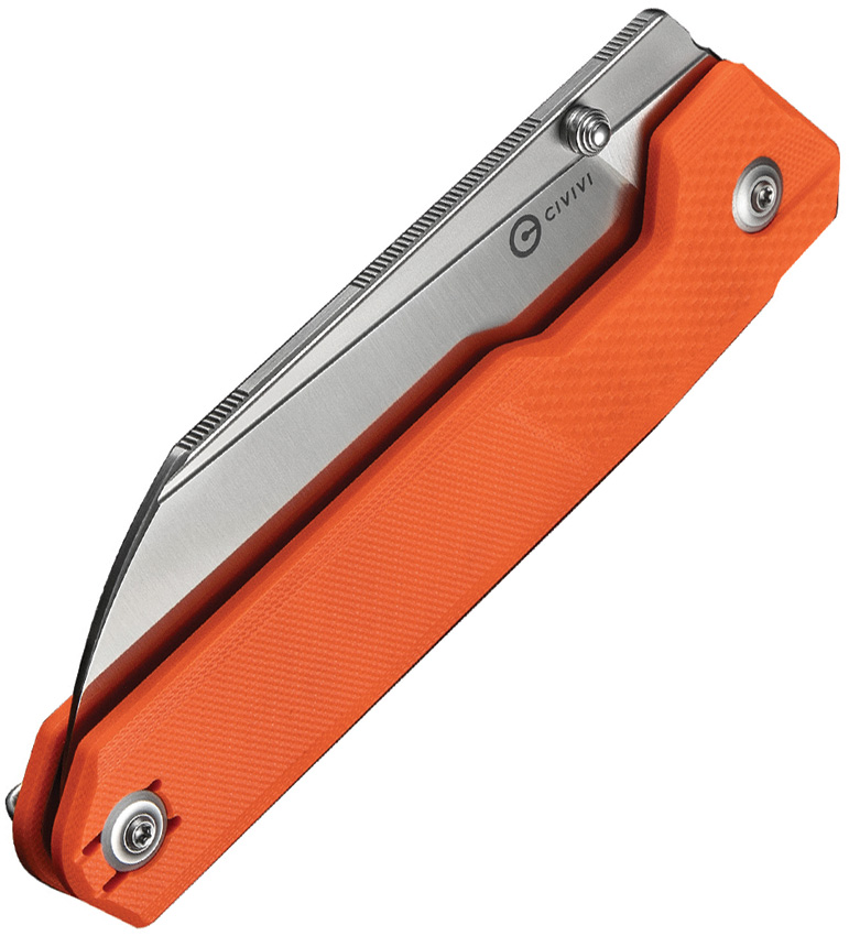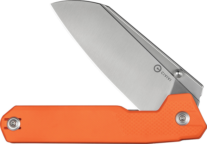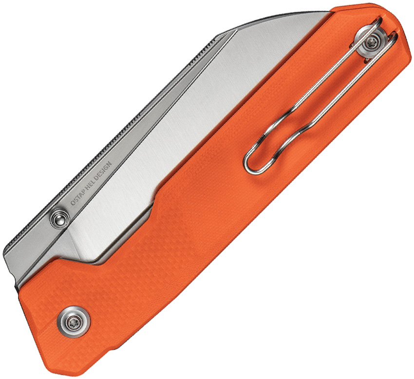 5.75″ (14.61cm) closed. 4.13″ (10.49cm) satin finish 14C28N Sandvik stainless blade. Orange G10 handle. Thumb stud. Pocket clip. Black nylon zippered storage case. Boxed. Sales Restriction: No Amazon.com Sales.
