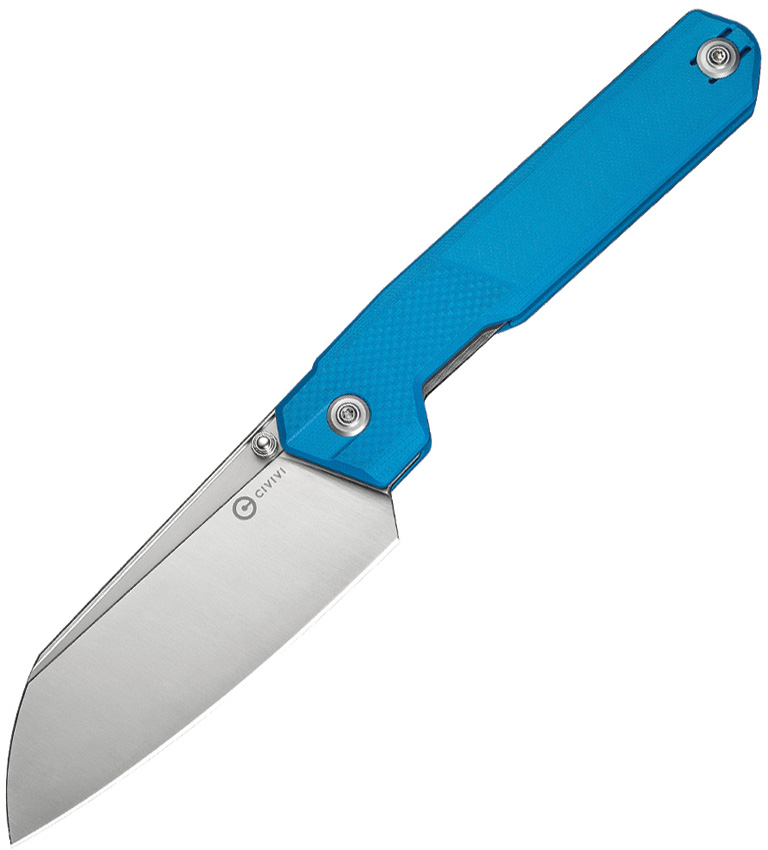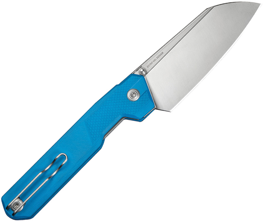5.75″ (14.61cm) closed. 4.13″ (10.49cm) satin finish 14C28N Sandvik stainless blade. Blue G10 handle. Thumb stud. Pocket clip. Boxed.