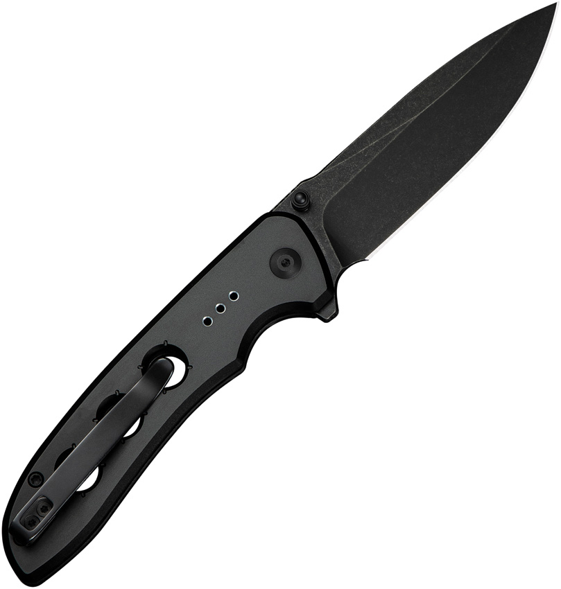 4.5″ (11.43cm) closed. 3.5″ (8.89cm) black stonewash finish 14C28N Sandvik stainless drop point blade. Black aluminum handle. Extended tang. Thumb stud. Pocket clip. Black nylon zippered storage case. Boxed.