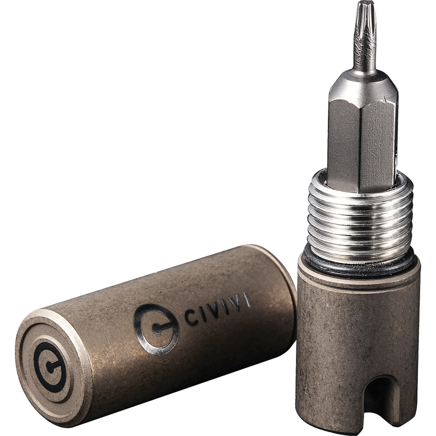 1.69″ overall. Bronze finish titanium container. Torx screwdriver tool (T6, T8). Keyring. 5 extra rubber O-rings. Boxed.