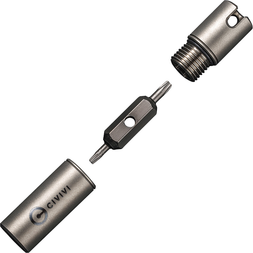 1.69″ overall. Gray titanium container. Torx screwdriver tool (T6, T8). Keyring. 5 extra rubber O-rings. Boxed.