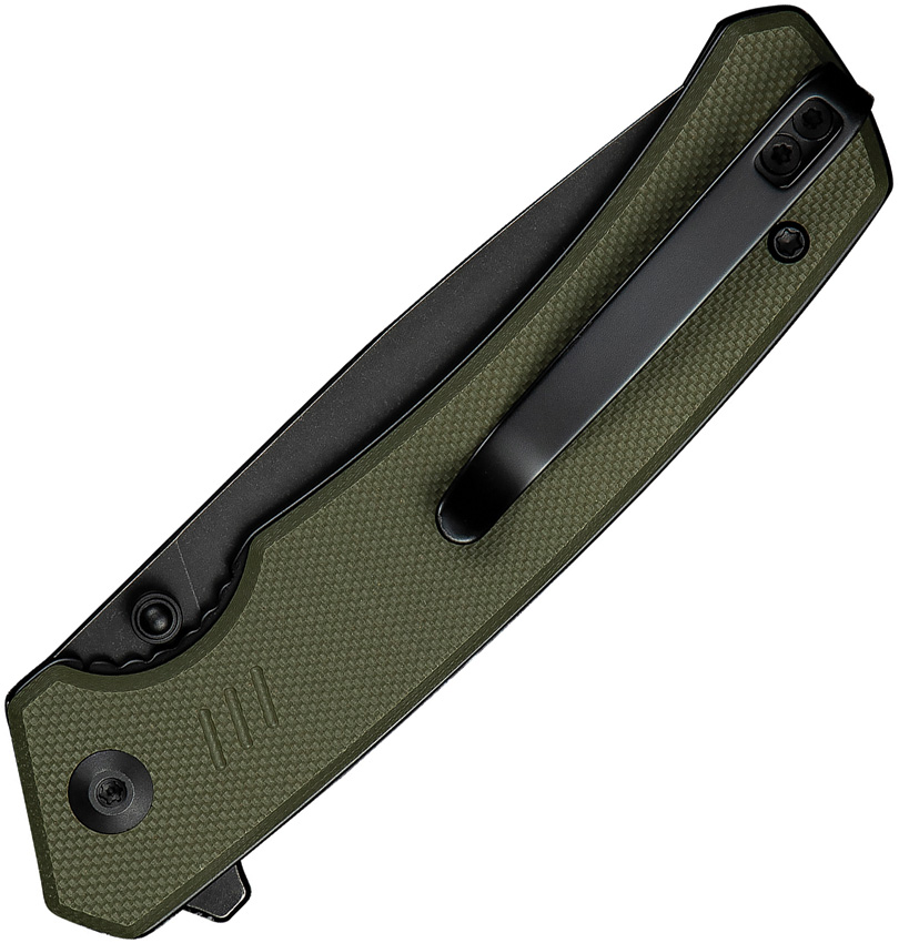 4.25″ (10.8cm) closed. 3.25″ (8.26cm) black stonewash finish 14C28N Sandvik stainless drop point blade. OD green G10 handle. Extended tang. Thumb stud. Pocket clip. Black nylon zippered storage case. Boxed.