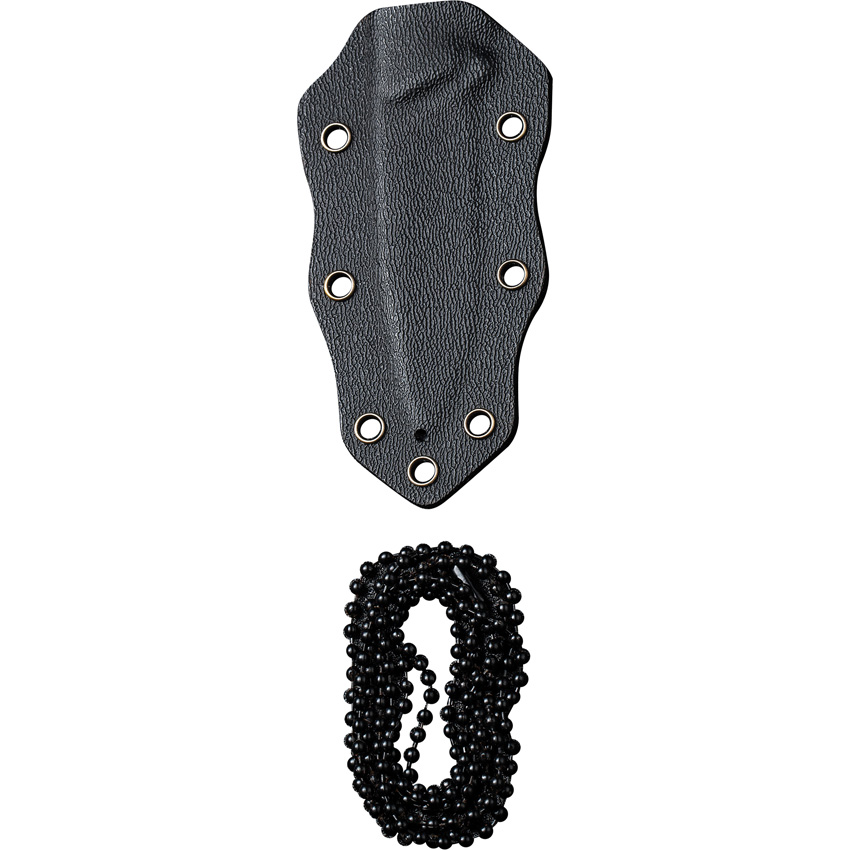 5″ (12.7cm) overall. 2.25″ (5.72cm) black finish Damascus steel blade. Green canvas micarta handle. Full tang. Lanyard hole. Ball chain lanyard. Black Kydex neck sheath. Boxed.